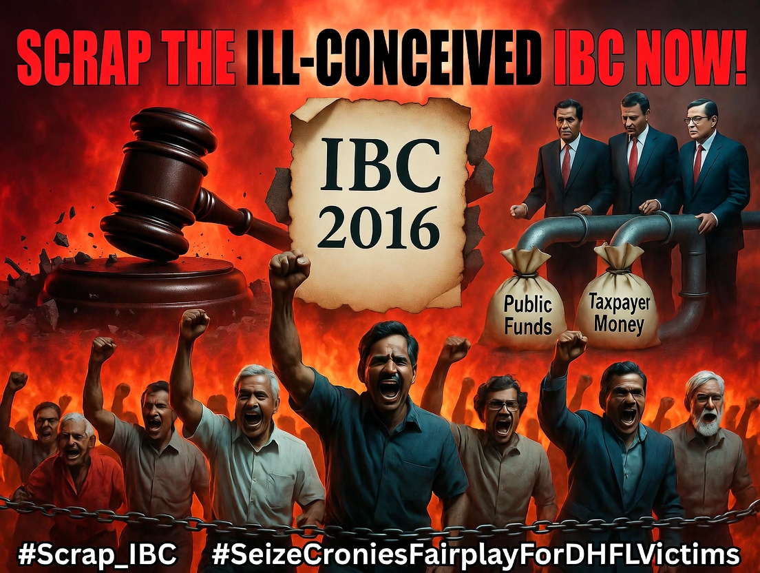 - Demand Immediate Scrapping of the IBC 2016: Petition the Government, Parliament, and Supreme Court to repeal the code in its entirety. Launch nationwide campaigns: #Scrap_IBC #ScrapIllConceivedIBC #SeizeCroniesFairplayForDHFLVictims.