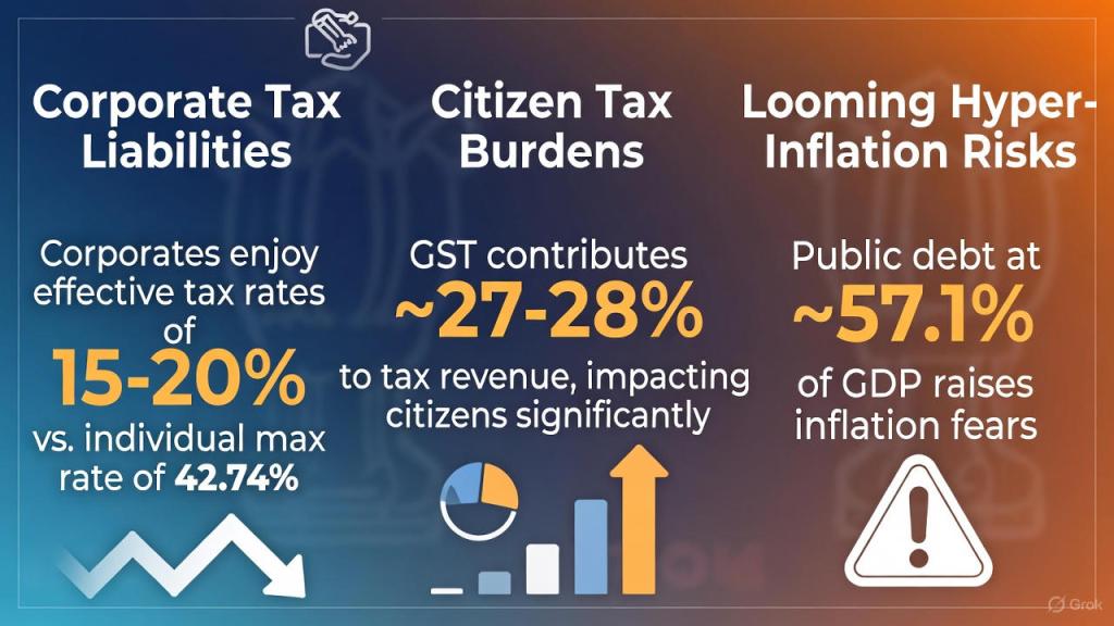 In India, heavy reliance on regressive GST/PIT already suppresses consumption; shocks like poor monsoons, commodity spikes, or global disruptions could ignite food/fuel inflation, compelling RBI tolerance of higher prices amid sluggish growth. The insulated corporate-political nexus—shielded by tax breaks and contracts—hoards profits, while exploited citizens face devastation: the poor and middle class, already overburdened, lose most in any inflationary storm. Without aggressive progressive reforms—sharper corporate/wealth taxes, GST exemptions on essentials, and pruning crony outflows—this debt-fueled delusion risks a catastrophic hyper-inflationary crisis, expropriating the public’s hard-earned wealth to sustain crony-monopoly capitalist dominance. True reform demands prioritizing citizens over cronies, lest the system collapse under its own regressive weight.