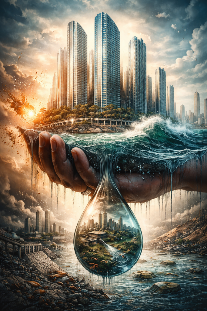 The glass towers rising along the city’s shoreline promise permanence and prosperity. Yet beneath their reflections lie aquifers, canals, mangrove forests, and tidal waters whose ecological limits cannot be permanently engineered away.