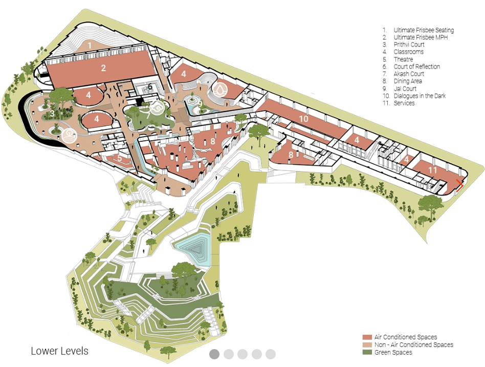 But perhaps the most celebrated—and symbolically loaded—aspect of the campus is its biophilic design philosophy, which elevates the project from mere sustainability to a near-spiritual manifesto. The entire campus is conceptualized as a grand “walled garden”, drawing inspiration from ancient Indian traditions of open-air, shared learning spaces under trees and in shaded enclosures. Rather than a single monolithic edifice, the PSL environment unfolds as a constellation of interconnected pavilions, fluid circulation paths, shaded corridors, and lush open areas. At its spatial and experiential heart lie five major courtyards, each symbolically aligned with elemental themes (earth, water, fire, air, space), functioning as the living, breathing core of the campus. These open-to-sky spaces—poetically described by the architects as “the unbuilt”—are deliberately crafted to encourage informal encounters, quiet personal reflection, spontaneous conversation, and serendipitous human connections among participants in training programs. Trees of native and drought-resistant species, landscaped gardens with regionally appropriate planting palettes, shaded pathways lined with stone and greenery, and intimate gathering areas create an immersive environment that blurs—almost dissolves—the boundary between built form and natural landscape.