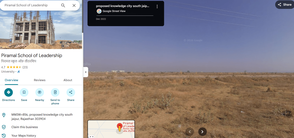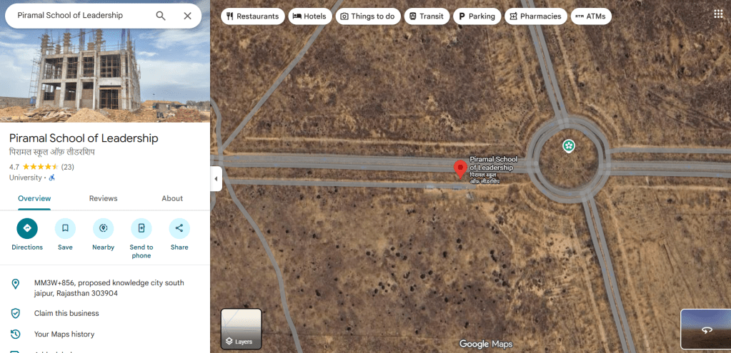 And so we solemnly arrive at the Piramal School of Leadership campus itself—a landscape where architecture, climate, and corporate narrative converge with striking precision. The campus is “still not there” when viewed through Google Maps, yet it is very much present when encountered through Instagram, Youtube, official websites, and curated digital imagery. It becomes a kind of phantom presence for us: absent in one register, hyper-visible in another. We arrive at it physically, yet we have already arrived through a stream of carefully crafted images—each projecting a vision of transformation, purpose, and institutional spirit.
